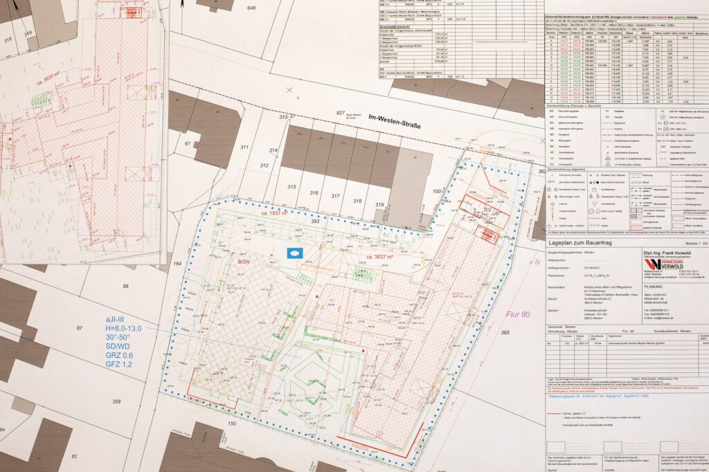 Für einen Bauantrag benötigen Sie einen Lageplan mit planungsrelevanten und baurechtlichen Angaben zum geplanten Gebäude. Wir als öffentlich bestellter Vermessungsingenieur können diesen mit öffentlichem Glauben beurkunden. Dies wird für einige Bauvorhaben benötigt.